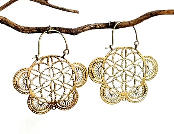 Pendientes de aro de latón para mujer con diseño floral bohemio y acabado dorado